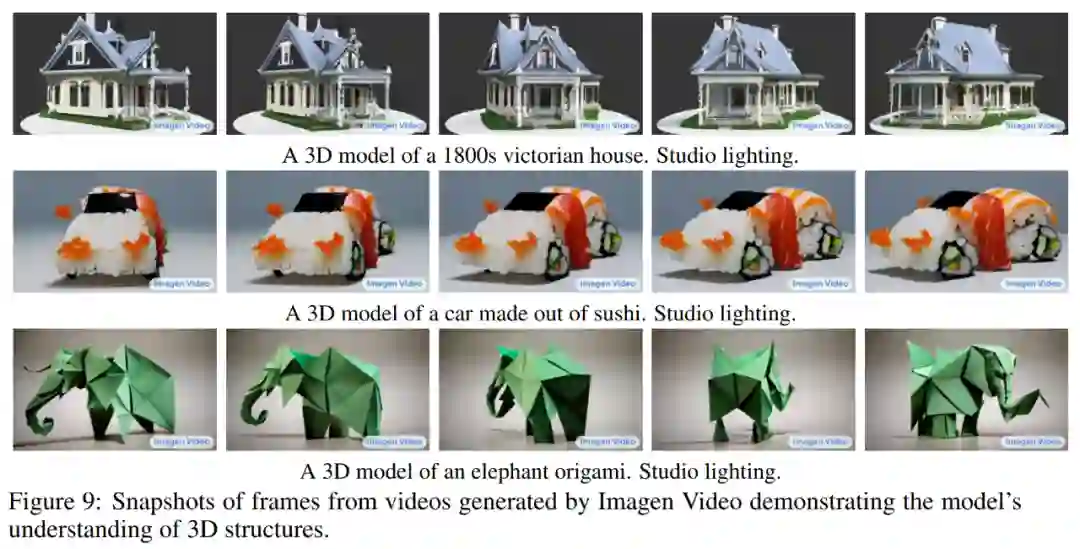下图 9 展示了 Imagen Video 对 3D 结构的理解能力,它能够生成旋转对象的视频,同时物体的大致结构也能保留。
