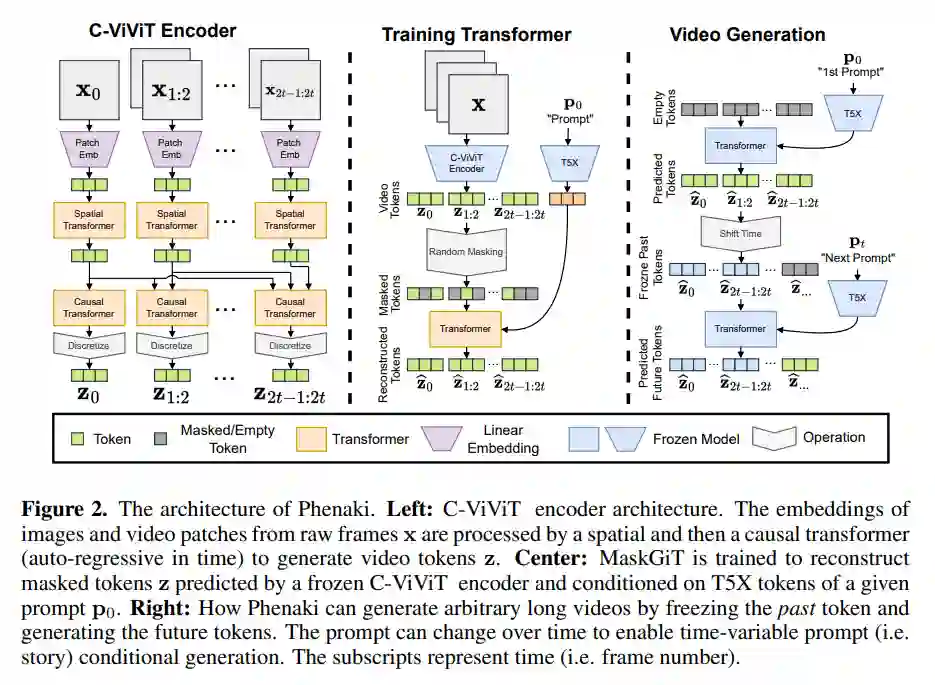 在 Phenaki 中,研究者的目标是生成可变长度的视频,同时尽可能压缩视频 token 的数量,这样就可以在当前的计算资源限制下使用 Transformer 模型。为此,他们引入了 C-ViViT,这是 ViViT 的一种因果变体,为视频生成进行了额外的架构更改,它可以在时间和空间维度上压缩视频,同时保持时间上的自回归。该功能允许生成任意长度的自回归视频。
