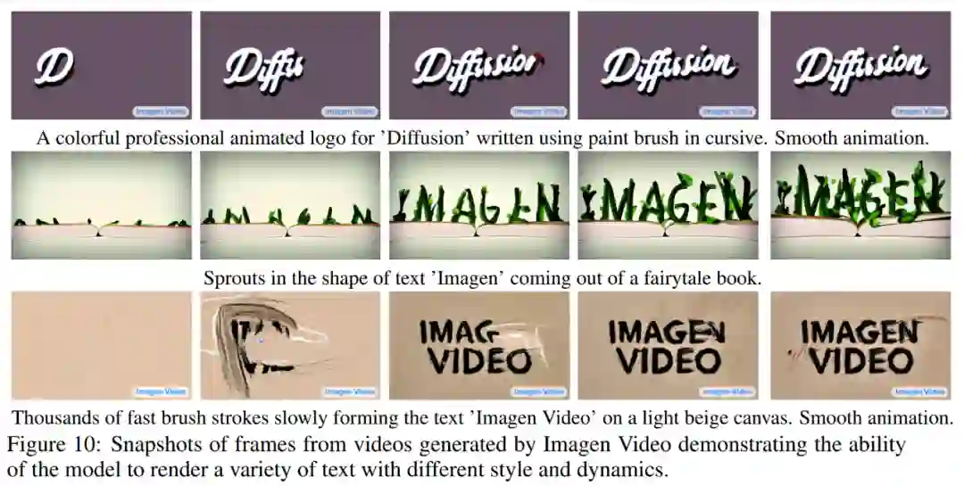 下图 10 展示了 Imagen Video 能够可靠地生成各种动画样式的文本,其中一些使用传统工具很难来制作。