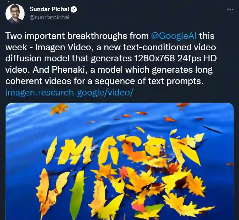 当然,谷歌也不甘示弱。刚刚,该公司 CEO Sundar Pichai 亲自安利了他们在这一领域的最新成果:两款文本转视频工具——Imagen Video 与 Phenaki。前者主打视频品质,后者主要挑战视频长度,可以说各有千秋。