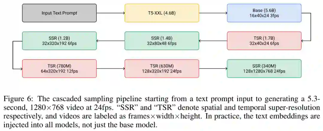 下图 6 展示了 Imagen Video 的整个级联 pipeline,包括 1 个 frozen 文本编码器、1 个基础视频扩散模型以及 3 个空间超分辨率(SSR)和 3 个时间超分辨率(TSR)模型。这七个视频扩散模型共有 116 亿参数。