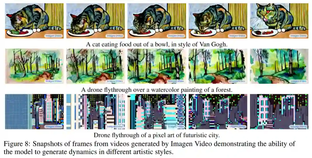 下图 8 展示了 Imagen Video 能够生成具有从图像信息中学得的艺术风格的视频,例如梵高绘画风格或水彩画风格的视频。