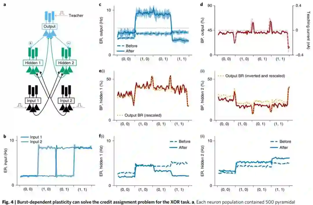 如今借助算力,Naud、Richards 和他们的合作者成功地模拟了他们的模型,其中突发神经元(bursting neurons)扮演了学习规则的角色。他们表明,突发神经元解决了 XOR 经典任务中的信用分配问题,该任务需要学习在两个输入之一为 1 时做出响应。此外,研究结果还表明,使用他们的突发规则构建的深度神经网络可以近似反向传播算法在具有挑战性的图像分类任务上的性能, 不过该研究仍有改进的余地。