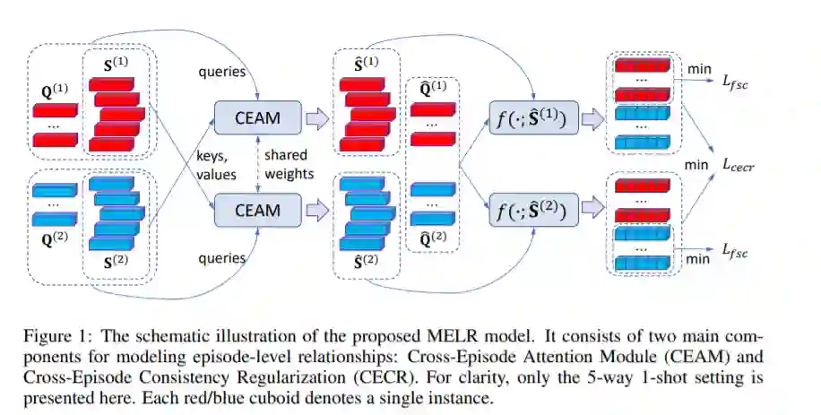 最近的小样本学习方法几乎都是基于场景式(元任务式)训练,即为了模仿测试时的情况,每个元任务中对于每个类只采样少量训练样本(支撑样本)。然而,这种严格仿照测试情况的训练方式有个副作用,即训练得到的模型容易受到少量支撑样本的坏采样的影响。在本工作中,我们第一次以探索场景之间关系的方式来尝试解决该问题。特别地,我们提出了一个新颖的建模场景级别关系的元学习(MELR)框架:通过采样两个拥有相同类别集合的场景用于元训练,MELR用来保证训练得到的模型在元测试阶段对于质量不高的支撑样本的存在是鲁棒的。这可以通过设计两个关键部件来实现:(1)一个跨场景注意力模块(CEAM)来提高模型减少坏采样支撑样本带来的反作用的能力;(2)一个跨场景一致性正则(CECR)来保证分别在两个场景下独立得到的两个分类器有一致的表现。在两个基准数据集上,大量标准小样本学习实验显示我们的MELR相比于我们使用的基准方法(原型网络)取得了1.0%- 5.0%的性能提升,而且在相同设置下打败了最新的方法。