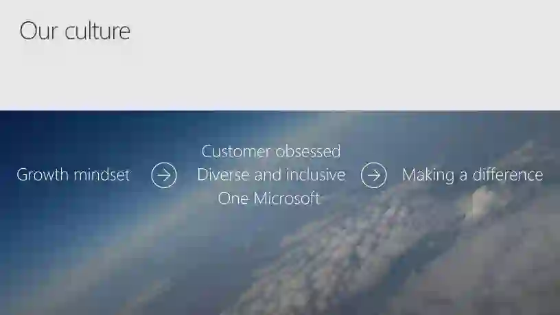 最终,我们决定将公司文化与成长型思维相结合,并着重于三个方面:客户至上,多元与包容,以及一个微软。而这些归根结底都是服务于微软公司的使命,予力每个人、每个企业成就不凡。