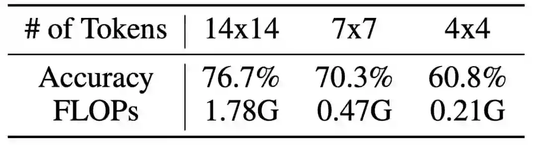 假设模型结构固定,即每个 token 的维度大小固定,将输入表征为更多的 token 可以实现对图片更为细粒度的建模,往往可以有效提升模型的测试准确率;然而与此相对,由于 Transformer 的计算开销随 token 数目成二次方增长,增多 token 将导致大量增长的计算开销。为了在精度和效率之间取得一个合适的平衡,现有的 ViT 模型一般将 token 数设置为 14x14 或 16x16。