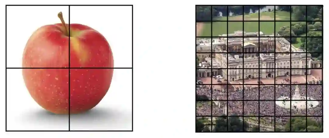 而论文则提出,一个更合适的方法应当是,根据每个输入的具体特征,对每张图片设置对其最合适的 token 数目 。具体而言,不同图片在内容、远近、物体大小、背景、光照等诸多方面均存在较大的差异,将其切分为相同数目和大小的 patch 没有考虑适应这些要素的变化,因而极有可能是次优的。以下图为例,左侧的苹果图片构图简单且物体尺寸较大,右侧图片则包含复杂的人群、建筑、草坪等内容且物体尺寸均较小。显然,前者只需要少量 token 就可以有效表征其内容,后者则需要更多的 token 描述不同构图要素之间的复杂关系。