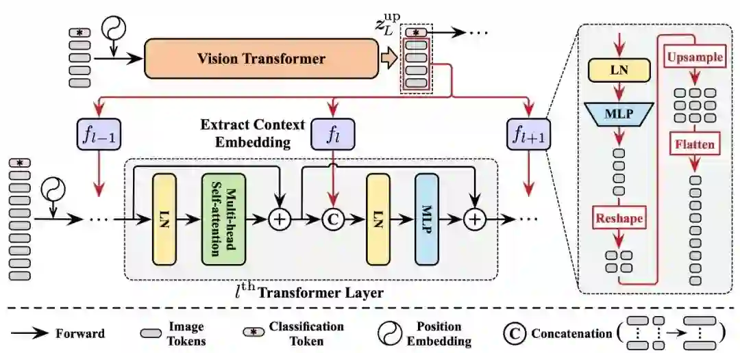 显然,DVT 框架中所有的 Transformer 都具有相同的训练目标。因此当一个处于下游位置的 Transformer 被激活时,一个显然更为高效的做法是,应当训练其在先前 Transformer 已提取的特征的基础上进行进一步提升,而非完全从 0 开始重新提取特征。出于这一点考虑,论文提出了一个特征复用机制,如下图所示。将上游 Transformer 最后一层输出的特征取出,经 MLP 变换和上采样(Upsample)后,作为上下文嵌入(Context Embedding)以 Concat 的方式整合入下游模型每一层的 MLP 模块中。