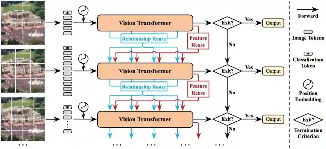 以 ViT 为代表的视觉 Transformer 通常将所有输入图像表征为 固定数目的 tokens(例如 16x16 和 14x14) 。这项工作发现采用定长的token序列表征数据集中所有的图像是一种低效且次优的做法,并提出一种可针 对每个样本自适应地使用最合适的 token 数目进行表征的动态 ViT 模型 。 该方法在 ImageNet 上将 T2T-ViT 的平均推理速度(GPU 实测)加快了 1.4-1.7 倍 。其主要思想在于利用级联的 ViT 模型自动区分“简单”与“困难”样本,实现自适应的样本推理。为了减少级联模型中的冗余计算,文章还提出了特征重用与关系重用的模型设计思路。