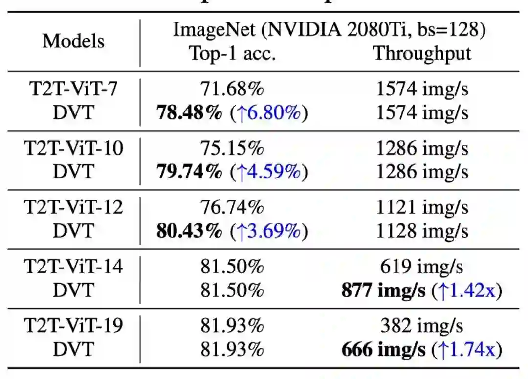 ▲ 表2 DVT (T2T-ViT) 在ImageNet上的实际速度