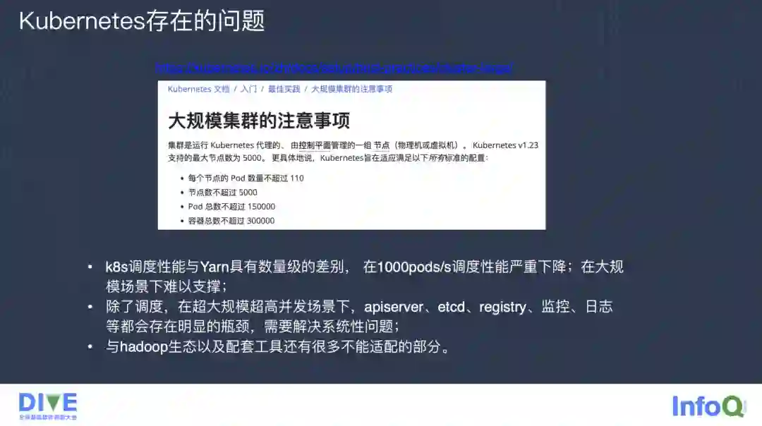 根据压测,Kubernetes 在一千个 Pod 每秒的调度情况下性能有严重下降,难以支持大规模的数据调度场景,除了调度之外,在超大规模集群的高并发场景下,apiserver、etcd、监控、日志等都会存在明显的瓶颈,这些都是需要解决的问题,因为 Kubernetes 的节点和 Pod 的状态信息都存在 etcd 里。Kubernetes 除了通过 ListAndWatch 的事件监听方式感知 Node 变化外,也会定时从所有 Node 节点查询更新事件。五千个节点的限制主要是因为 etcd 的性能限制,尤其是在 etcd 进行大量并发查询的情况下。