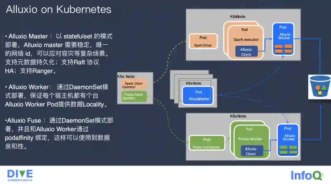 Alluxio Fuse 也可以通过 DaemonSet 方式部署,并且它可以和 Alluxio Worker 通过 PodAffinity 进行绑定,这样可以达到数据的亲和性,Fuse 主要使用在 AI 场景,它可以通过 Mount 文件到业务的方式直接读取文件,业务端就不需要感知和考虑 Alluxio 数据端的部署模式以及 Pod 的位置,当然 Alluxi 也支持 CSI 这种方式的 Mount。
