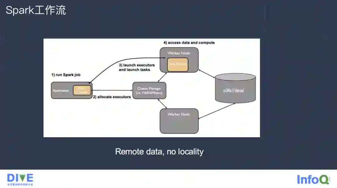 先看一下 Spark 在物理集群中常见的工作流状态。首先通过 Spark submit client 提交运行一个 Spark job 到 Yarn 或者 Mesos,接着 Yarn 或 Mesos 分配一个 Worker 节点作为 Executor 给 Spark client,Spark client 会从 Worker 节点起动 Spark Executor 并且在 Executor 里起动一个物理执行计划的 Task 任务。Spark Executor 的每一个 Task 都要从远端的 Ozone 或者 S3 这种对象存储访问数据并进行计算,这种模式的计算都是通过网络 IO 从远端访问数据,整体的网络时延和 IO 都会影响整体的计算速度。