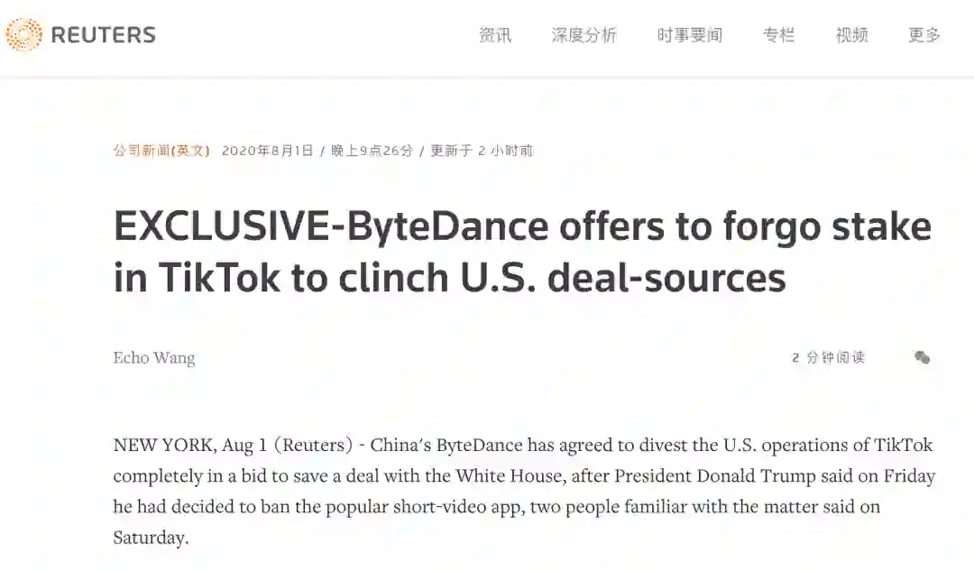 【字节跳动同意剥离TikTok美国业务,总经理在Twitter表示“不会离开”,并称未来三年将在美国提供1万个工作岗位】路透社报道称,字节跳动同意剥离TikTok美国业务。此前特朗普接受采访时称,将命令字节跳动剥离其对TikTok的所有权。福克斯商业台在推特上透露,微软正在洽谈收购TikTok在美国的业务。不过有外媒报道称,特朗普上周五对美国公司收购TikTok美国业务表示反对,致使微软已暂停有关收购TikTok美国业务的谈判。