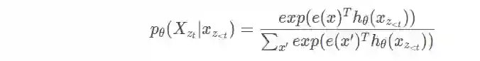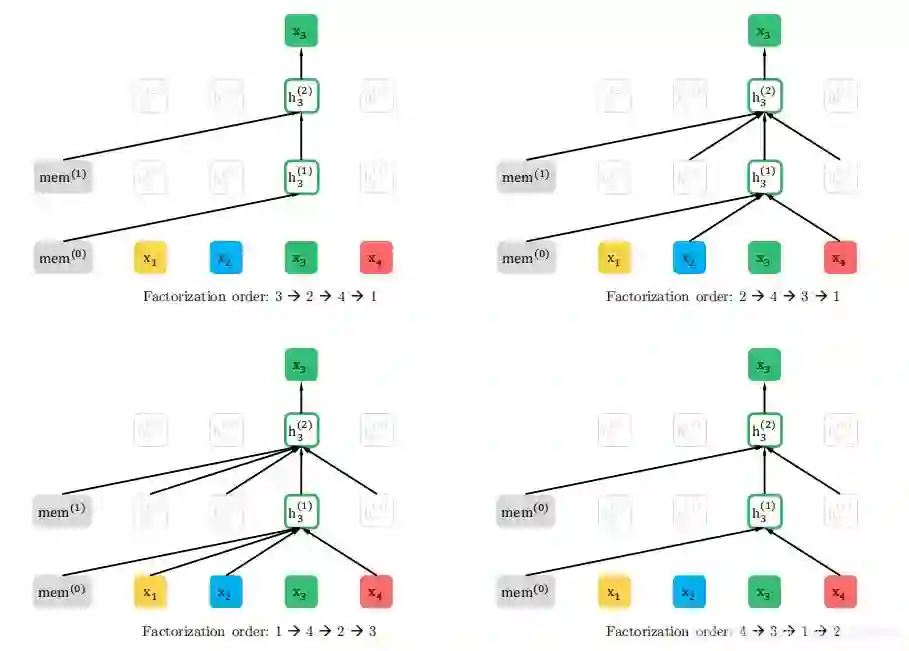 我们有4个因子就有24中排列,因此分解它很疯狂,对样本进行抽样,随机抽样,可能性是上图的公式,Zt是一切可能,这里表示24(4!)种分解,z是其中之一,本质上,对于文本序列X,我们一次采样一个分解顺序z,