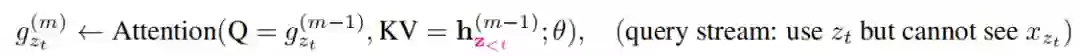 查询表示 g_θ(x_{z<t},z_t) ,简称g_zt,只访问上下文信息x_{z<t} 和位置z_t,而不访问内容x_zt,本位置的context embedding不参与计算,如上所述。公式如下: