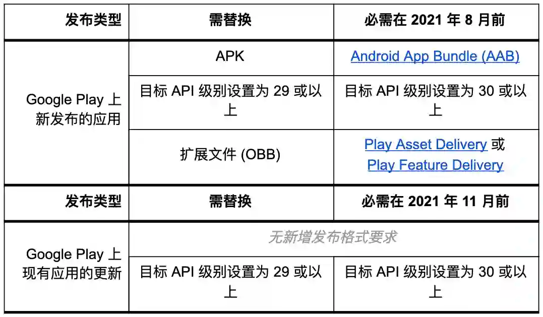 利用 Play Asset Delivery 或 Play Feature Delivery 交付下载大小超过 150 MB 的资源或功能。新应用将不再支持 APK 扩展文件 (OBB);
