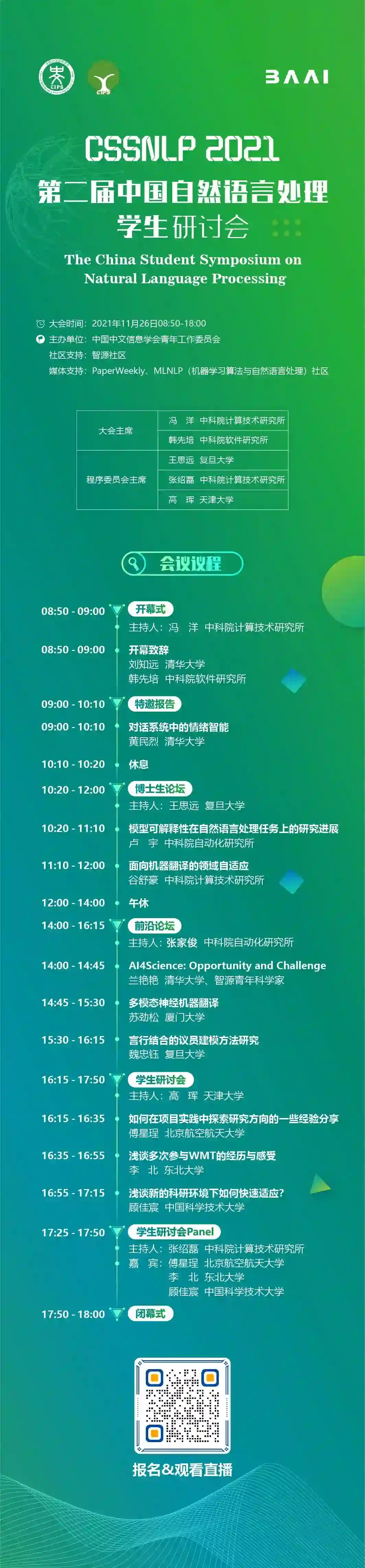 第二届中国自然语言处理学生研讨会(The China Student Symposium on Natural Language Processing, CSSNLP 2021)将于2021年11月26日于线上举办,会议主办单位为中国中文信息学会(CIPS)青年工作委员会。本次会议包含特邀报告、博士生论坛、前沿论坛和学生研讨会等四个环节,主要目的是为自然语言处理研究领域内的中国青年学者提供一个学术交流平台。同时鼓励更多的青年学者关注自然语言处理前沿研究,展示最新科研成果,促进国内青年学者的思想交流和学术合作,进而推动自然语言处理在中国的发展。本次研讨会邀请了黄民烈、兰艳艳、苏劲松、魏忠钰等著名学者担任特邀嘉宾进行学术分享,并且邀请了多位优秀博士生分享研究成果和科研心得。 本次会议中的所有报告的著作权/版权由报告人所有,论文的版权/著作权遵从相关会议的约定,也提醒大家尊重作者和会议的相关权利。整个会议报告人和听众均自愿参与,主办方仅承担议程协调和会务组织工作。 感谢社区支持伙伴智源社区,及媒体支持伙伴PaperWeekly、MLNLP(机器学习算法与自然语言处理)社区的大力支持。