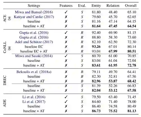 本文执行一个大规模的实验研究在这个联合模型任务上,使用了不同的语境和语言的数据集。建立了一个强大的基线,它的性能优于所有以前的模型;而且模型依赖于自动提取的特性,实现了最先进的性能。另外与基线模型相比,在训练过程中应用AT可以让联合抽取的效果持续增加。