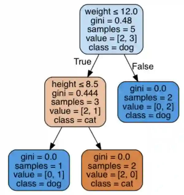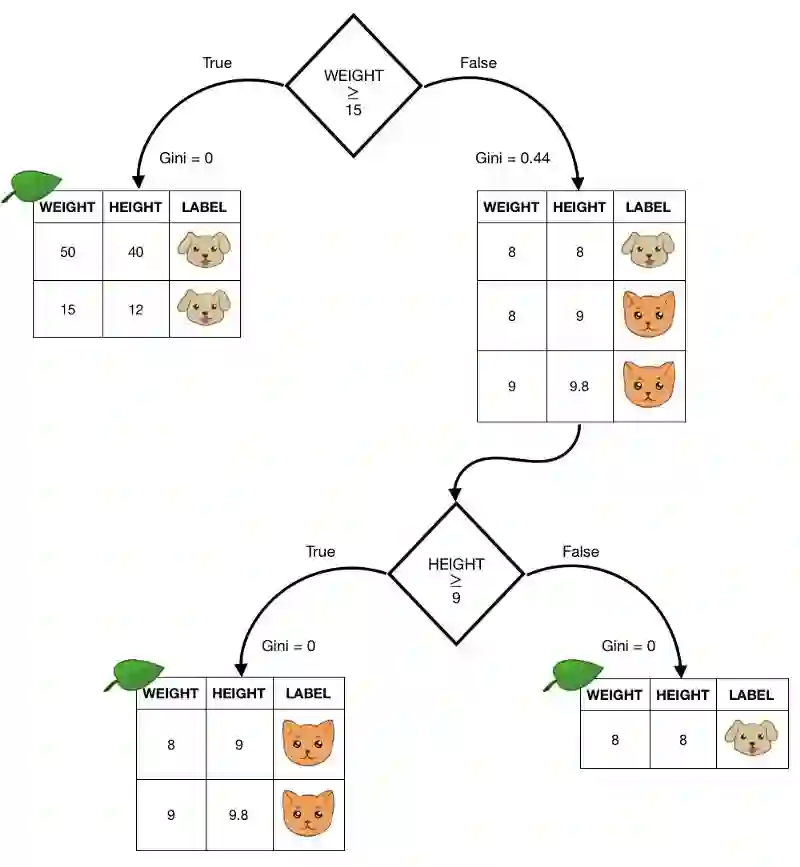 很牛逼,对吧~ 尽管在我们的‘手稿’中,我选择了‘15磅重量’作为我的根节点,算法依据同一个变量判断分支,但是对于12这个值则创建了一个只有一条狗的叶节点(对于已有的元素重量大于12磅时,事实上基尼系数为0)。根节点后为真的情况下生成了子集,并且进一步依靠重量变量8.5磅为判断依据进行分支。最后一个分支生成了无基尼系数的两个纯子集。