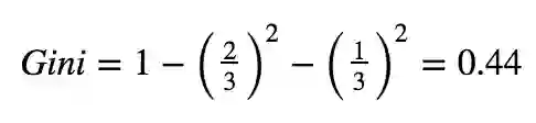 出于这个原因,当子集中只有一个类时,基尼系数会为0.因为确实找到一类的可能性是1.在这个例子中,我们给定我们已经到达了叶节点,在这里不需要再进行分支操作了,我们已经达到了目的.但是如果我们看上面的图,当处于根节点之后的False情况下,我们有一个包含三个观测值的子集,两个是猫一个是狗,如果我们想计算这个子集的基尼系数,我们可以: