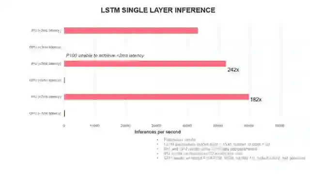 对于执行推理的服务器,还有一个问题在于等待推理结果的最短延迟时间。下表展示了单层 LSTM 网络在不同的延迟要求下,IPU 与 GPU 的表现对比: