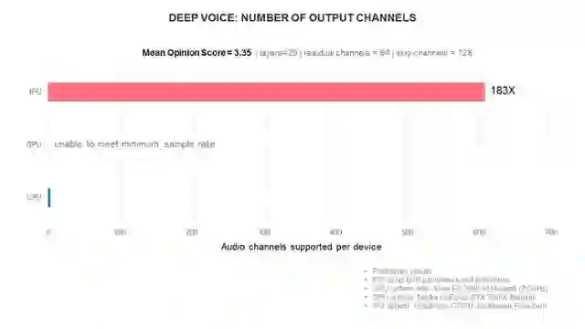 我们的应用试验了两类性能指标。首先,生成一个样例需要多少时间。在实践中,样本的生成速度需要足够快,这样才能生成实时数据流(例如 16Khz);如果可以生成实时数据流,我们还需考虑可以生成多少个声道(产生不同的说话者)。