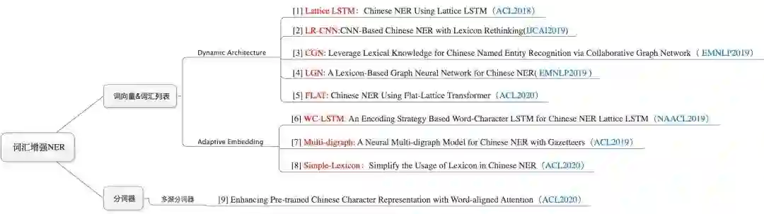 如何在中文NER模型中引入词汇信息,是近年来中文NER的一个研究重点。下图展示了各大顶会中词汇增强NER的主要进展: