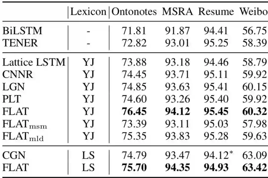 由于篇幅所限,本文将包含FLAT在内多种词汇增强方式进行了对比,感兴趣的同学可以进一步阅读有关文献。