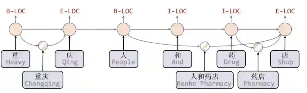如上图所示,Lattice LSTM引入了word cell结构,对于当前的字符,融合以该字符结束的所有word信息,如「店」融合了「人和药店」和「药店」的信息。对于每一个字符,Lattice LSTM采取注意力机制去融合个数可变的word cell单元,其主要的数学形式化表达为: