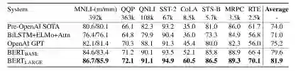 GLUE(General Language Understanding Evaluation)是一系列自然语言处理任务的集合。其中包含的数据集大多已经存在多年,而 GLUE 将其划分为训练集、测试集和验证集,并建立了测评服务以缓解测评机制不一致和测试集的过拟合问题。GLUE 不公布测试集答案,使用者需要提交自己的预测结果进行测评。如下图所示,BERT 在 GLUE 的各项任务上均取得了最佳结果。而图中显示的仅仅是 BERT 在单个任务上进行训练的结果。若模型进行多任务的联合训练,效果还会进一步提升。