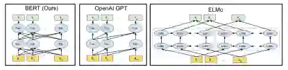 图 | 预训练语言模型间的差异 BERT 的 Transformer 使用了双向的自注意力机制(self-attention),OpenAI GPT 使用的是由左到右的 Transformer。ELMo 则使用了两个不同方向的 LSTM,将其输出结果拼接在一起。(来源:arXiv)