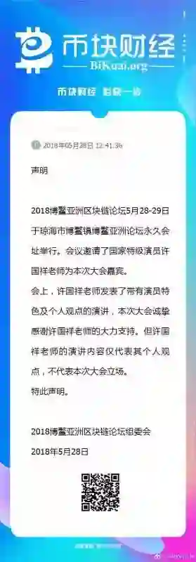“许国祥老师发表了带有演员特色及个人观点的演讲,但许国祥老师的演讲内容仅代表其个人观点,不代表本次大会方的立场。”5月28日中午,2018年博鳌亚洲区块链论坛组委会在币块财经上发表了这样一则声明。
