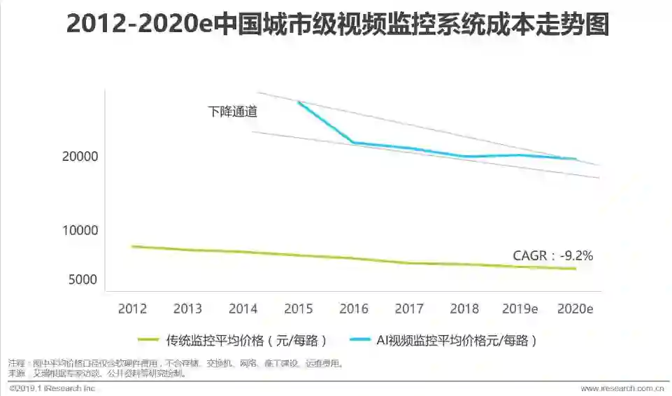在国产化的作用下,传统监控(包括模拟摄像机、高清摄像机等)的平均价格下降,2012年至2018年CAGR为-9.2%,而AI视频监控(包括前端智能、后端智能等)应用大部分出现于2015年,其价格走势也进入了下降通道,到2018年平均价格约为2万元一路,近几年将保持平稳下降态势。