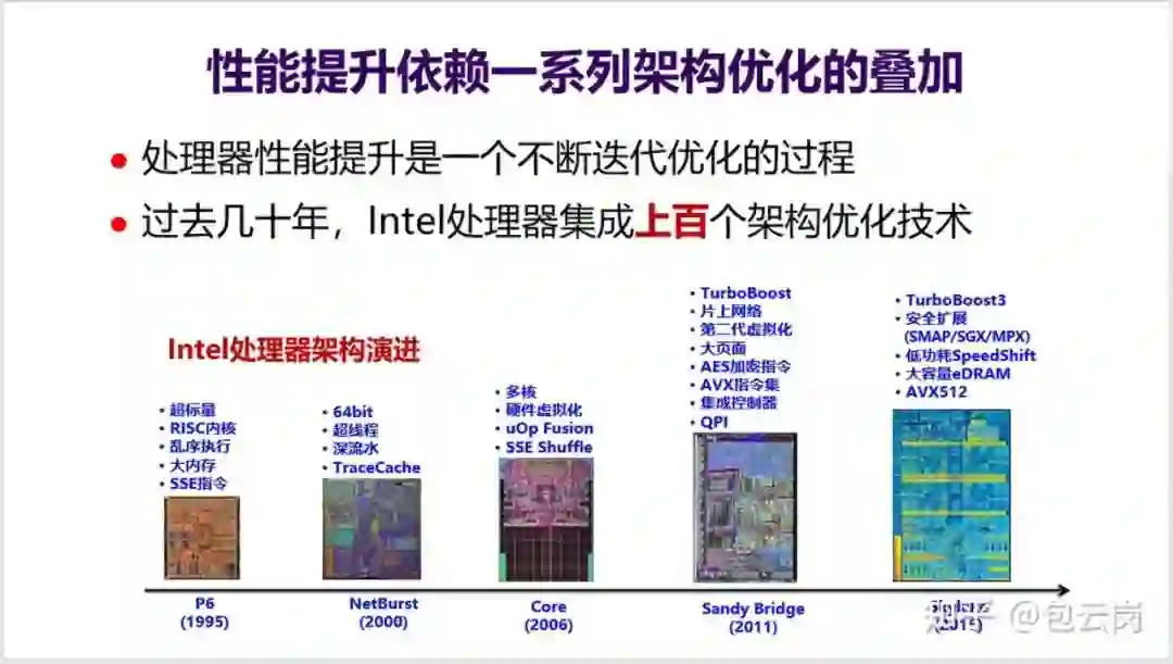 。下面这页 PPT 列出了 1995-2015 这二十年 Intel 处理器的架构演进过程——这是一个不断迭代优化的过程,集成了上百个架构优化技术。