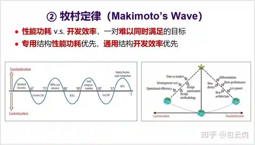 之间交替摆动,大概每十年波动一次。牧村定律背后是性能功耗和开发效率之间的平衡。