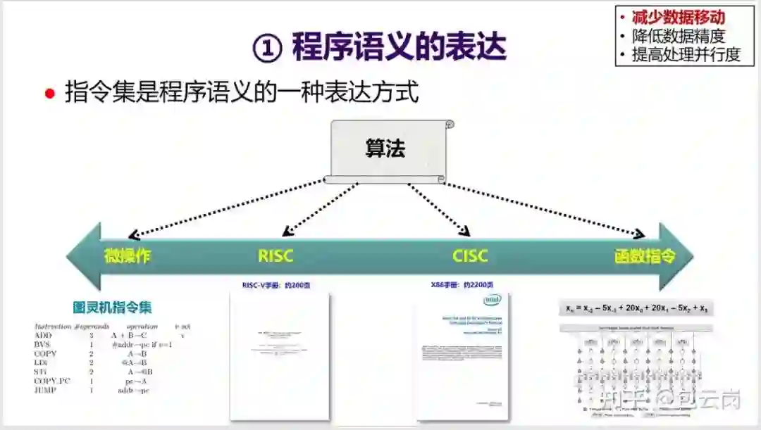 ——指令集是程序语义的一种表达方式。同一个算法可以用不同粒度的指令集来表达,但执行效率会有很大的差别。一般而言,粒度越大,表达能力变弱,但是执行效率会变高。