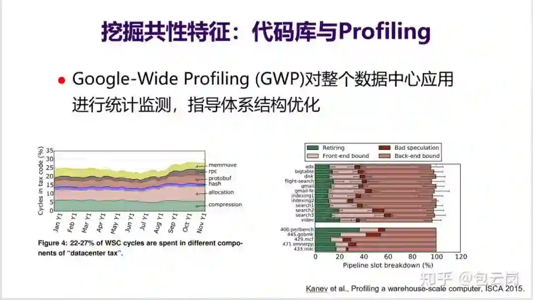 10. 发现和识别这种热点应用和热点代码并不容易,需要由很强大的基础设施和分析设备。比如 Google 在其数据中心内部有一个 GWP 工具,能对整个数据中心应用在很低的开销下进行监测与统计,找到算力被那些热点程序 / 代码消耗,当前的 CPU 哪些部件是瓶颈。比如
