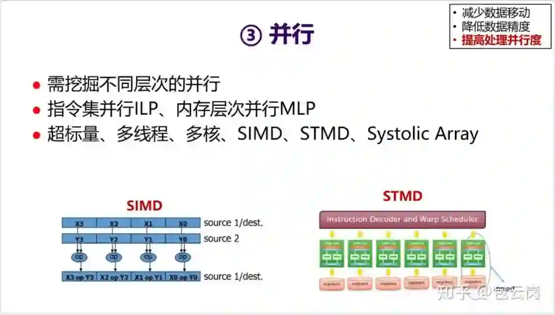 2. 体系结构层面 3 条优化路线——减少数据移动、降低数据精度、提高处理并行度。