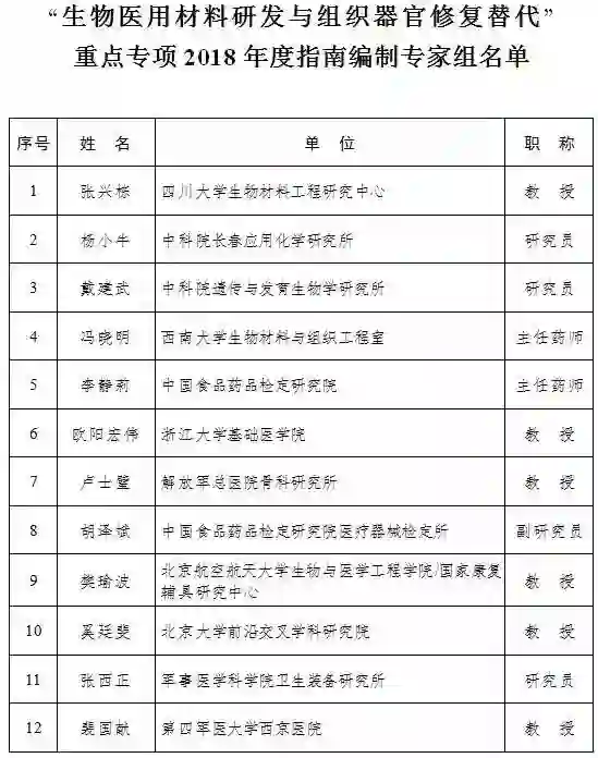 “生物医用材料研发与组织器官修复替代”重点专项2018年度项目申报指南
