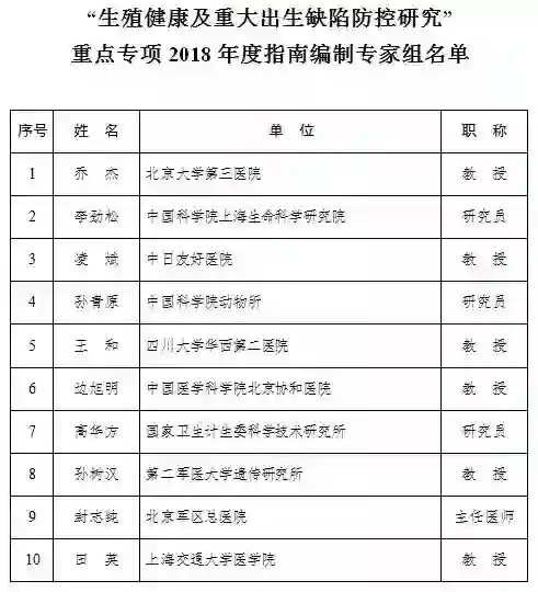 “生殖健康及重大出生缺陷防控研究”重点专项2018年度申报指南