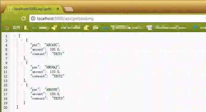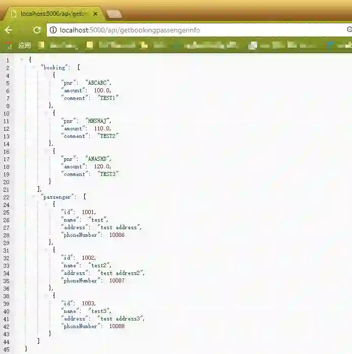 示例代码中我们在Aggregates节点下配置了路由聚合,它将两个请求的结果combine到一起再返回给客户端,当我们请求/api/getbookingpassengerinfo 时就会返回下面结果: