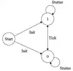 有了上面的PlusCal的基础,理解这一段TLA+也不难,重点在于Spec的理解。Spec定义了系统的行为,如图3描述了单比特时钟的行为,Init将clock初始化为0或1,Tick让clock在0和1之间来回跳转,Stutter让clock保持不变。TLA+运行的过程其实就是在图上做遍历。