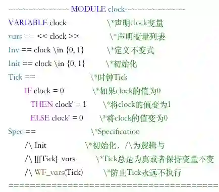 图1是单比特时钟的PlusCal描述,相信具有编程功底的同学都能轻易看懂。这段PlusCal代码可以直接使用TLA+提供的工具翻译成TLA+代码: