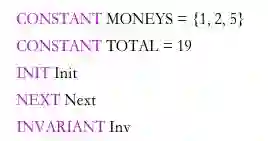 为了理解TLA+的运行原理,弄清楚它是怎么遍历的,我们可以在运行的时候加上一些参数,让TLC输出状态图。比如我们运行图6所示的一段TLA+代码,图7是运行所需要的cfg文件。这个例子试图找出用面值为1、2和5的钱组合出19块钱的所有组合方式。