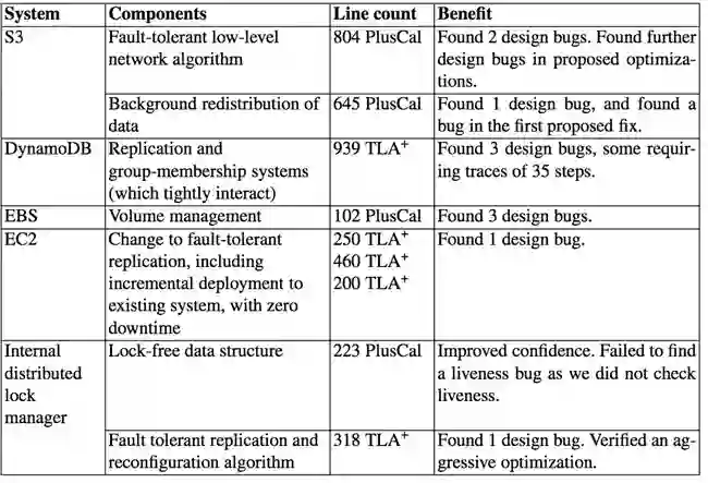 Lamport的TLA+主页上列出了一些TLA+在工业界的应用。以Amazon为例,Amazon AWS的一些系统的核心算法就使用了TLA+来做形式化验证,如表1列出了TLA+给AWS的一些系统找出的问题,其中涵盖了一些非常核心的组件,这些核心组件的问题一旦在线上暴露,造成的损失将是不可估量的。正是如此,现在分布式云服务的核心算法使用TLA+来对设计做验证已经成为行业标准了,所以作为云服务的从业者或者对此感兴趣的同学,熟悉TLA+绝对是不可或缺的加分项。