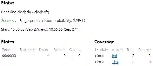 有了这两个文件,就可以用TLC来运行了,运行结束后得到如图5所示的结果,图中展示了一些统计信息。