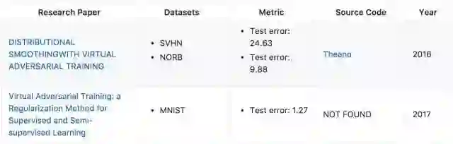 第二篇论文提出了一种基于虚拟对抗损失的新正则化方法:输出分布的局部平滑度的新测量手段。由于平滑度模型的指示是虚拟对抗的,所以这一方法又被称为虚拟对抗训练(VAT)。VAT 的计算成本相对较低。本文实验在多个基准数据集上把 VAT 应用到监督和半监督学习,并在 MNIST 数据上取得了 Test Error 1.27 的优异表现。