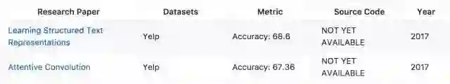 爱丁堡大学的 Yang Liu 等人提出了学习结构化的文本表征,在这篇论文中,他们关注于在没有语篇解析或额外的标注资源下从数据中学习结构化的文本表征。虽然目前暂时还没有相应的实现代码,不过他们在 Yelp 数据集上准确度能达到 68.6。而另一篇带注意力的卷积提出了了一种 AttentiveConvNet,它通过卷积操作扩展了文本处理的视野。