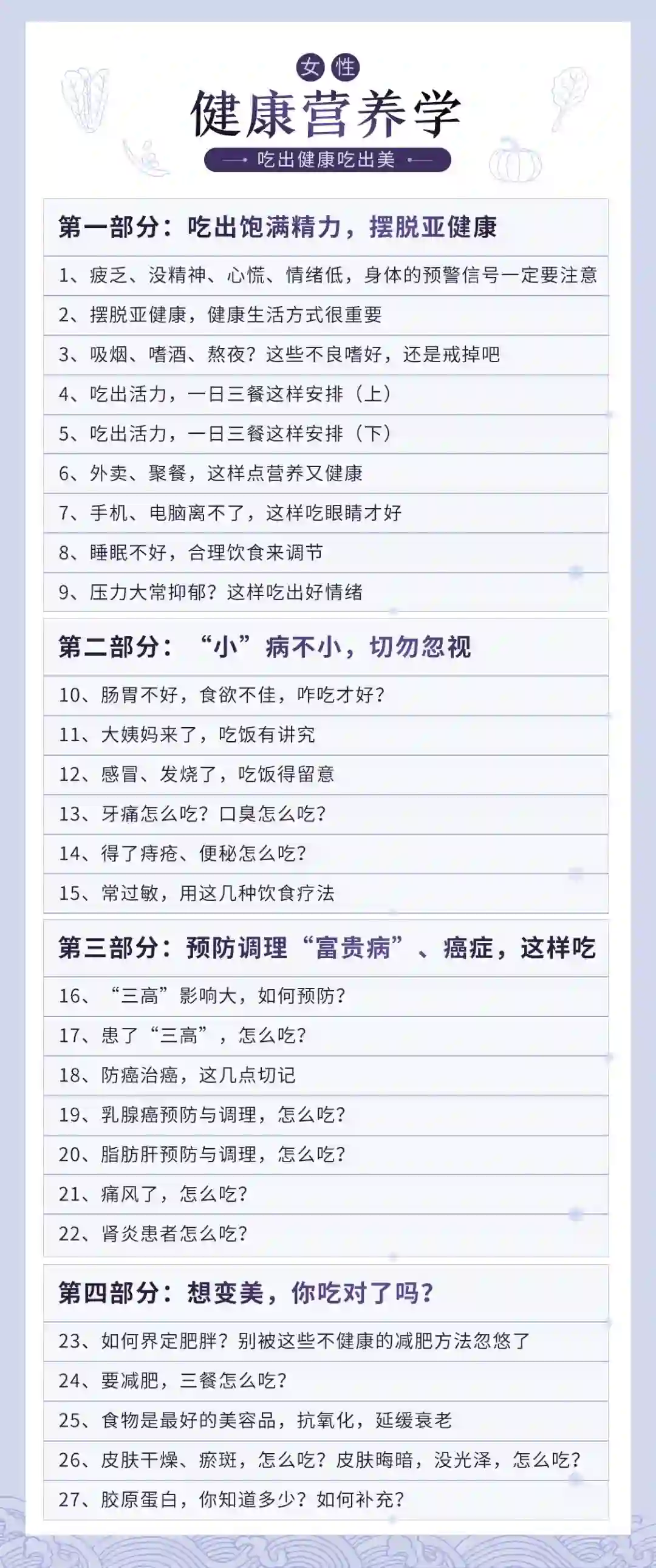 为了普及营养,让更多的中国人学会好好吃饭。我开设这门《女性必备健康营养学》,带你摆脱亚健康,远离慢性病,吃出健康、吃出活力、吃出美!